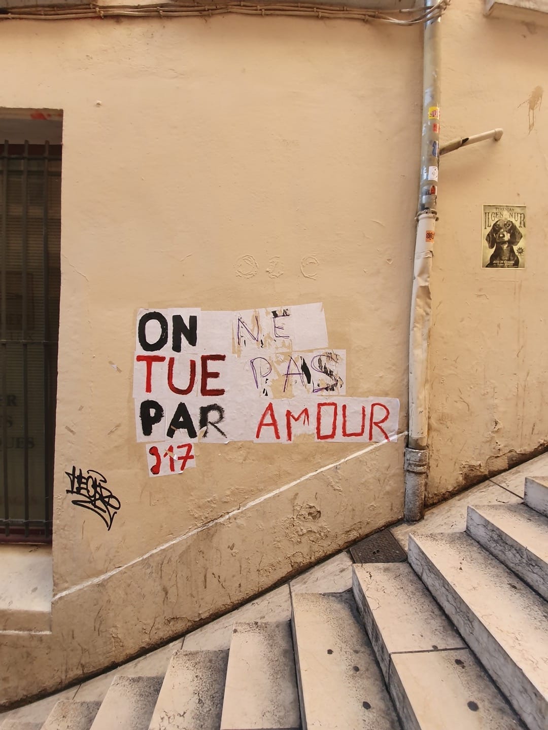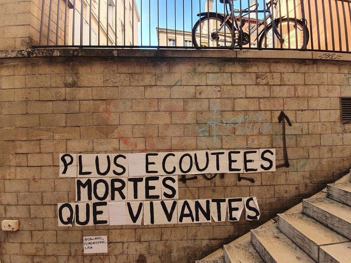 A scardinare il silenzio talvolta assordante che circonda queste morti stanno le colleuses. “Emilie, 38 anni, e Laura, 18 anni, assassinate a Montauban,” dice un muretto di Lione. “Razia, 34 anni. 7 denunce. Pugnalata,” risponde un manifesto a Marsiglia. “Numero 18, Caroline. Abbattuta da Cedric, il suo ex”, si legge a Grenoble.