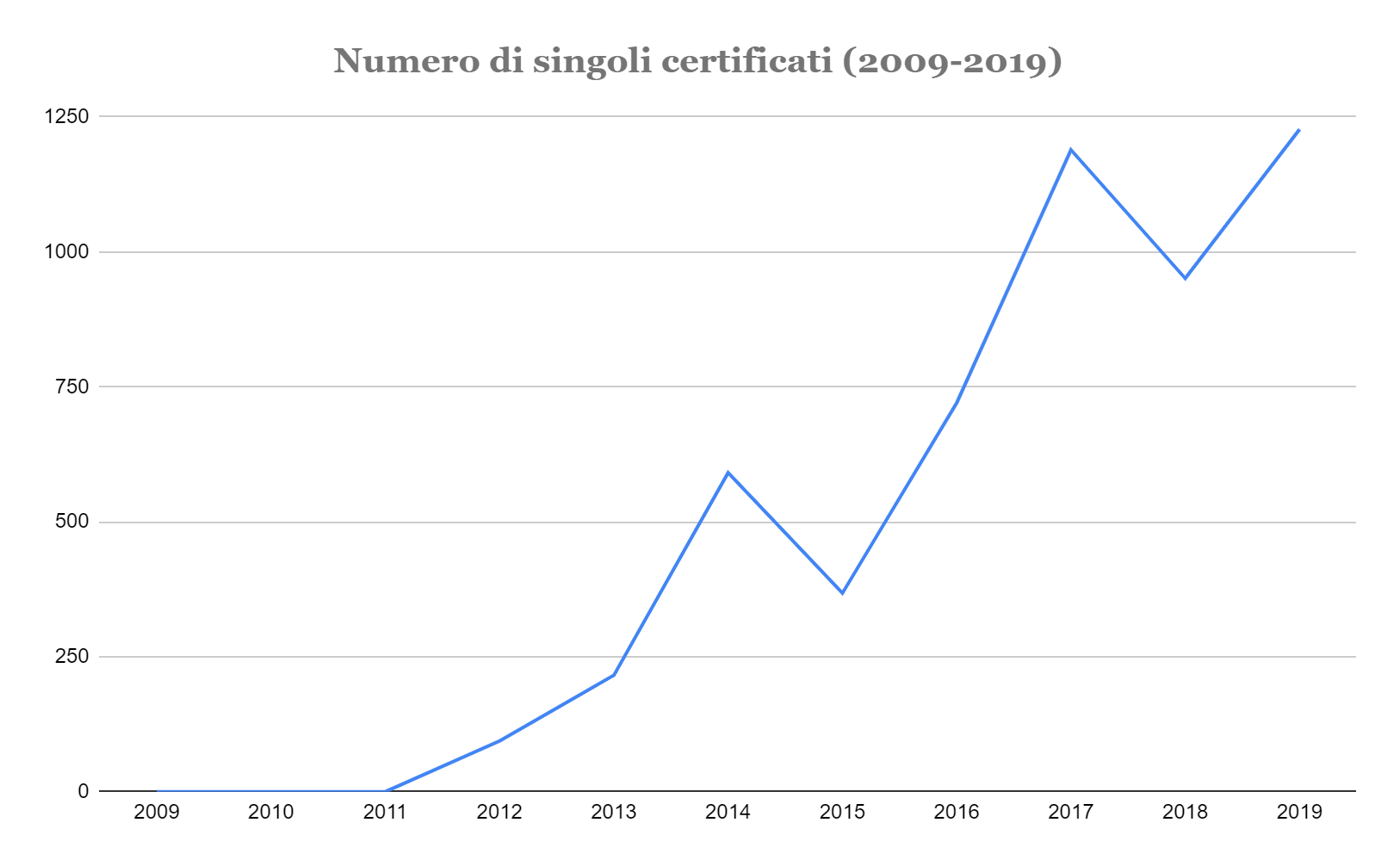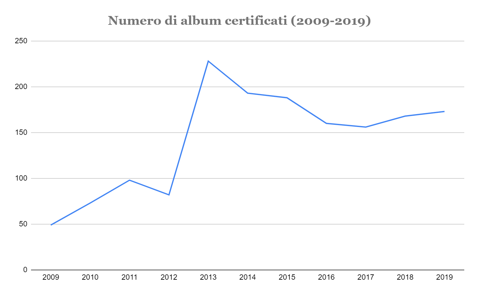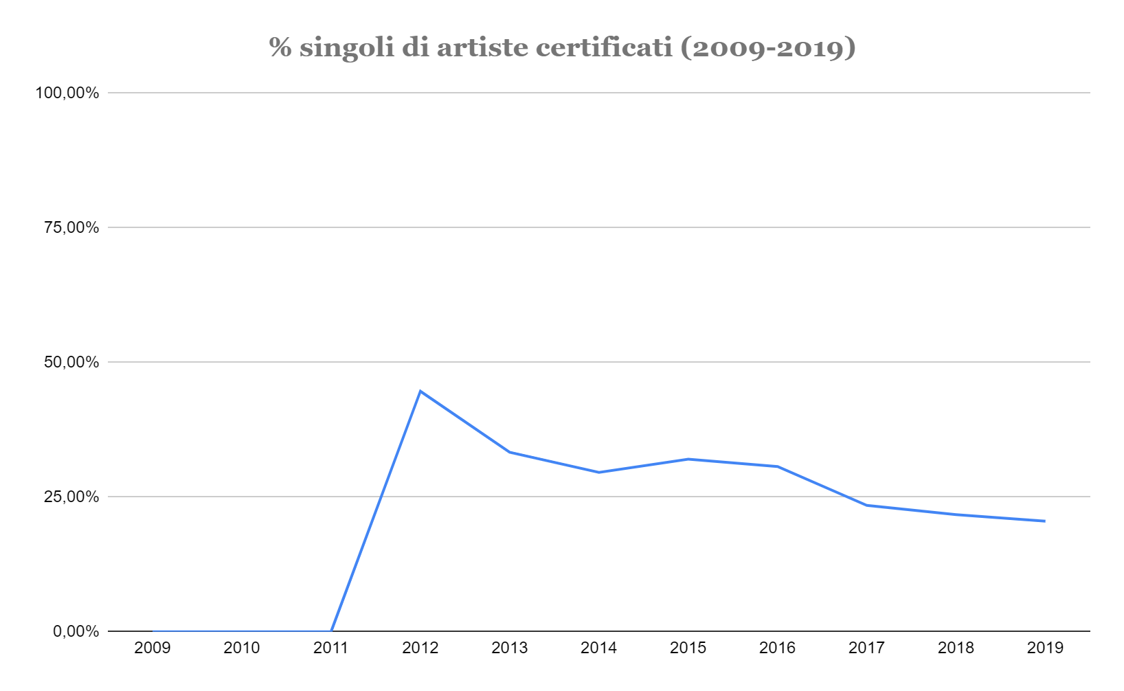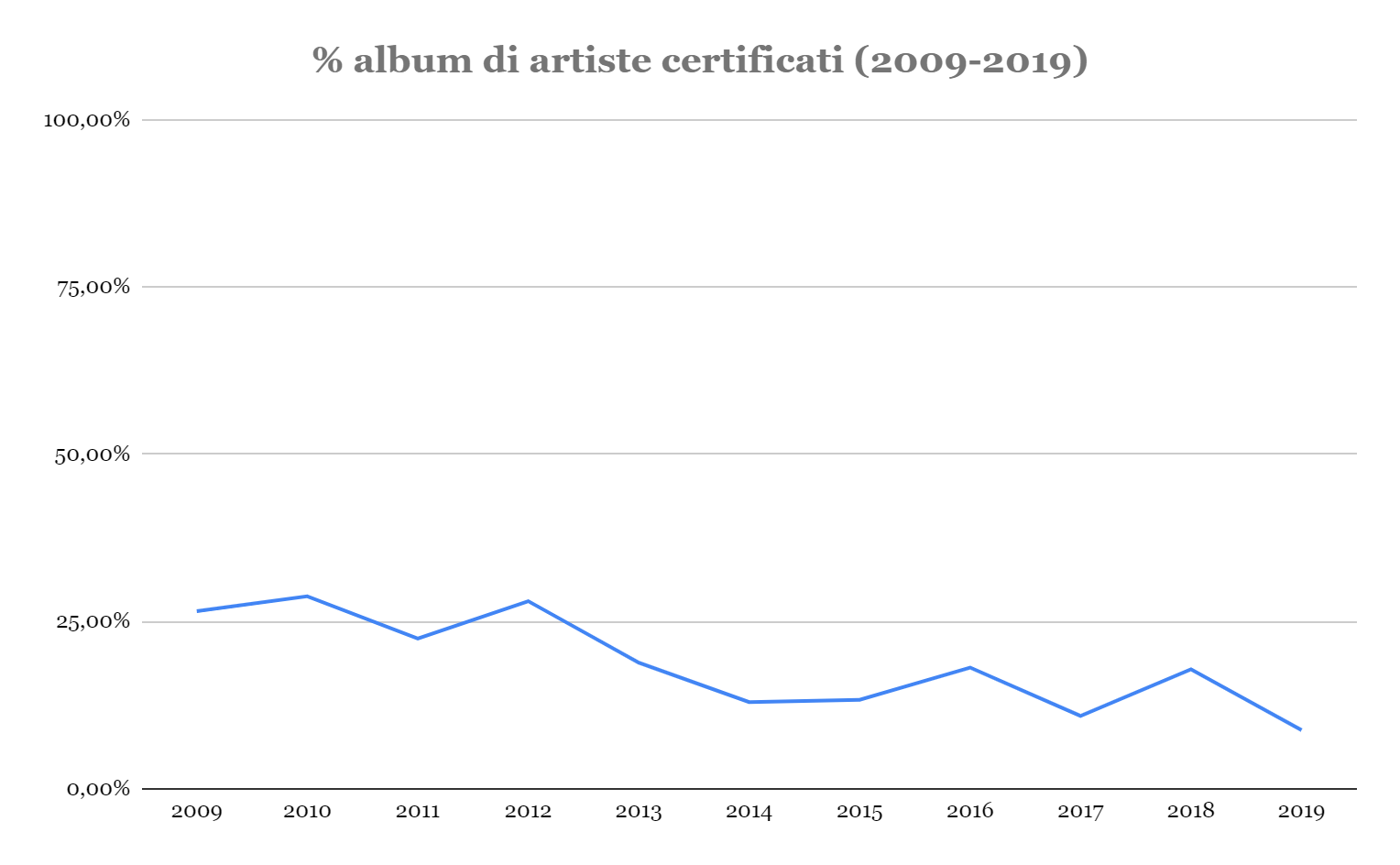 Nel 2009 su 49 album certificati multiplatino, platino o oro, erano presenti solo 13 artiste. Il 26,5% del totale. Il 2009 è il primo anno per cui sono disponibili online i numeri sulle certificazioni rilasciate da FIMI. Se si dà un’occhiata alla composizione di questa classifica e si fa un paragone con la situazione attuale è facile notare come allora fossero molte di più le artiste soliste rappresentate. Alcuni esempi: il disco di Gianna Nannini Dream: Solo i sogni sono veri aveva collezionato all’epoca due dischi di platino. Senza Nuvole, l’album di debutto di Alessandra Amoroso, veniva certificato triplo disco di platino. Poi, tra gli altri, c’era un triplo disco di platino di Laura Pausini (Laura Live World Tour 09), Elettra di Carmen Consoli (disco d’oro) ma anche Amy MacDonald con This is the life o Whitney Houston. E Giusy Ferreri con Gaetana — ebbene si, se vi ricordate quello era proprio l’anno in cui Giusy Ferreri debuttava con almeno un paio di singoli diventati famosi.I dati degli ultimi dieci anni