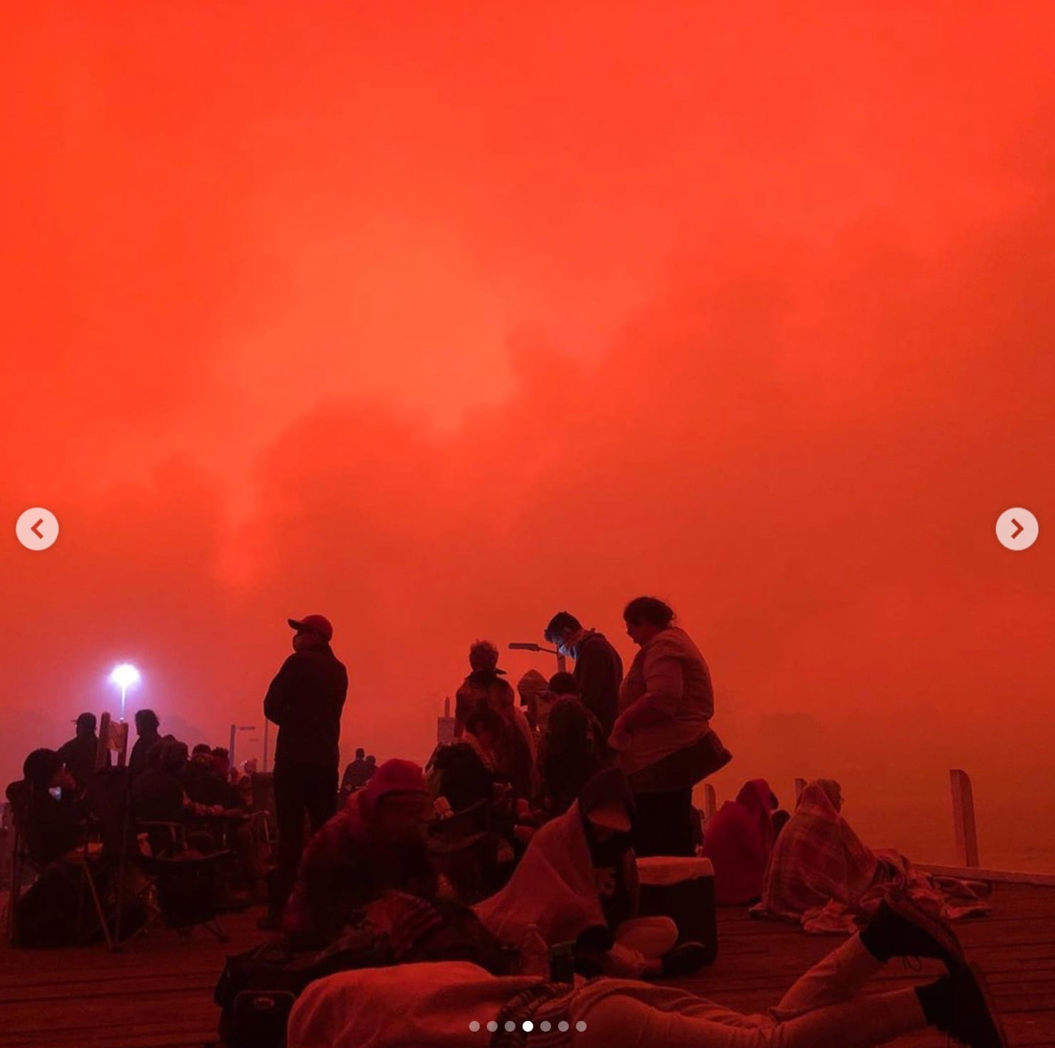 A Mallacoota i fuochi, filtrati dalle polveri sollevate nell’aria, hanno inghiottito la cittadina in un cielo arancione e rosso scuro. (The Age)