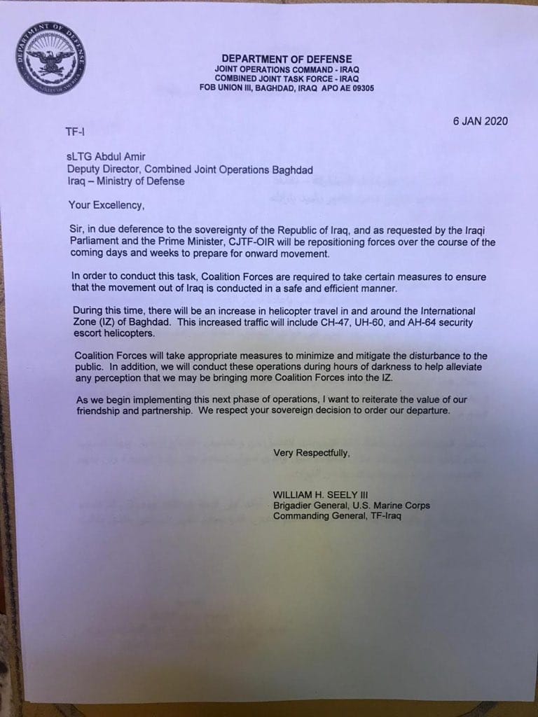 Si tratta di una versione dei fatti chiaramente posticcia — il testo della lettera è cristallino: il comandante generale statunitense in Iraq, William Seely, scriveva nel documento che le truppe sarebbero state riposizionate per “assicurarsi che l’uscita dall’Iraq sia condotta in modo sicuro ed efficiente.” L’espressione in inglese, “movement out of Iraq,” difficilmente può essere stata scritta con un significato diverso da quello interpretato dai media. (New York Intelligencer)