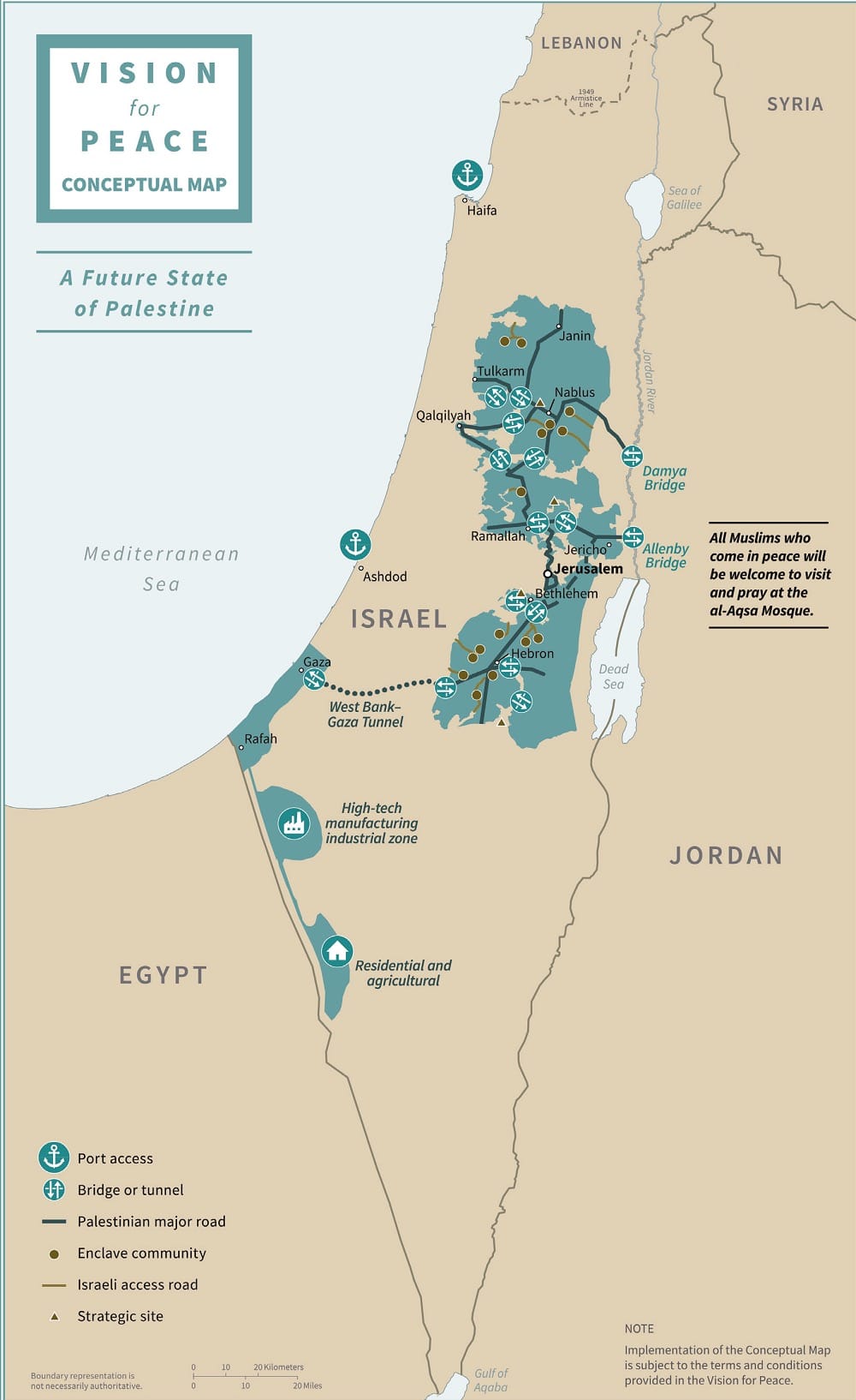 Nel documento sono presenti due mappe concettuali che descrivono “lo stato di Israele” e “un futuro stato della Palestina.” Le carte, che peraltro mascherano notevolmente la frammentarietà del proposto stato palestinese, mostrano sentieri stretti — e quindi facili da interrompere — per connettere le zone segregate, e quattro “siti strategici,” presumibilmente basi militari israeliane, all’interno o adiacenti ai territori palestinesi. Anche questa proposta, figlia di un chiaro disegno oppressivo, è inquadrata come una concessione — ed è soggetta a “Termini e condizioni” che i palestinesi dovranno rispettare.