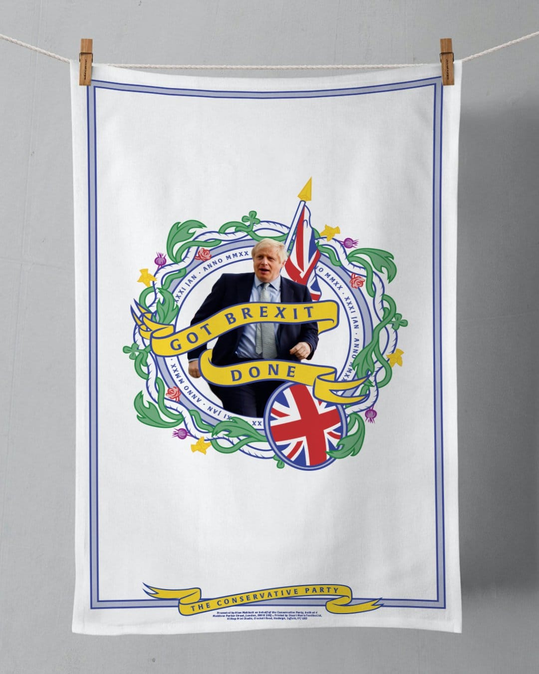 Non sarebbe una vittoria politica senza merch: sul sito dei Tories è disponibile un asciugapiatti celebrativo con uno stemma con la foto di Boris Johnson e la scritta “Got Brexit Done.” Il partito non ha rivelato quanti ne ha venduti — un silenzio che ci lascia sperare voglia dire nessuno. (Border Telegraph)