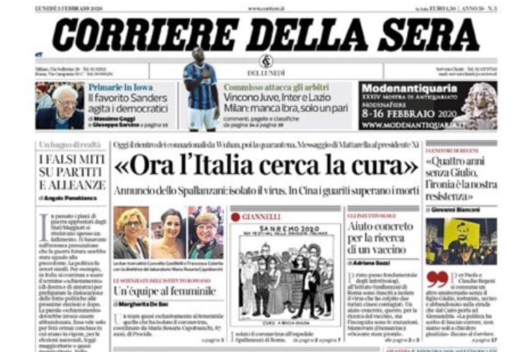 Anche il Corriere della Sera non scherza, con un’apertura trionfale, una dichiarazione virgolettata rilasciata chissà da chi: “Ora l’Italia cerca la cura.”