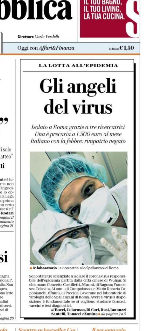 In realtà l’isolamento italiano, oltre ad essere successivo a quello cinese, non è nemmeno il primo in Europa: qualche giorno fa, alla fine di gennaio, gli scienziati francesi dell’Institut Pasteur sono riusciti a isolare il coronavirus, iniziando anche già a studiarlo. I ricercatori italiani insomma, proprio come i colleghi stranieri, hanno semplicemente fatto il proprio mestiere: anziché articoli-piagnisteo, meriterebbero quindi di essere pagati adeguatamente. A questo proposito — per capire come si sia persa un’ occasione per parlare dei problemi della ricerca italiana — ha avuto grande risalto la condizione contrattuale di una delle ricercatrici coinvolte, Francesca Colavita, secondo il Corriere della sera “precaria, con un contratto in scadenza nel novembre 2021.” Sarebbe opportuno, anziché provare a magnificare le virtù del Made in Italy, chiedersi come sia possibile che una persona evidentemente così preparata, scelta per affrontare un lavoro di tale delicatezza, sia in una posizione lavorativa così difficoltosa. Ma no, evidentemente le priorità sono altre: la storia di Colavita è raccontata con molto pathos e paternalismo, ma senza farsi troppe domande.