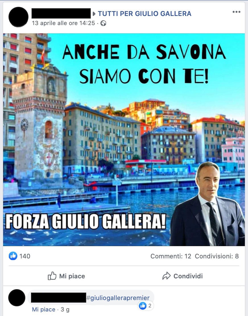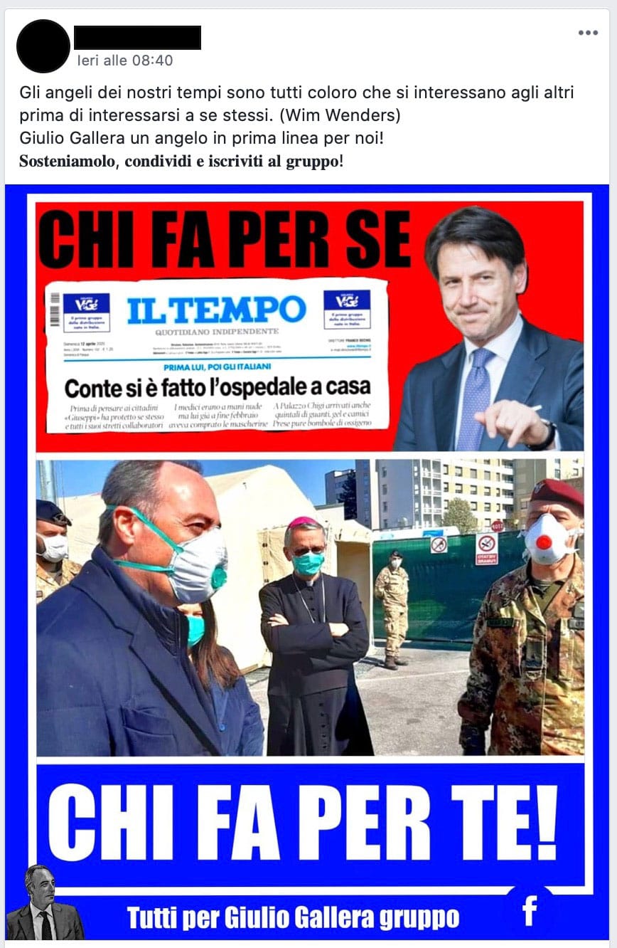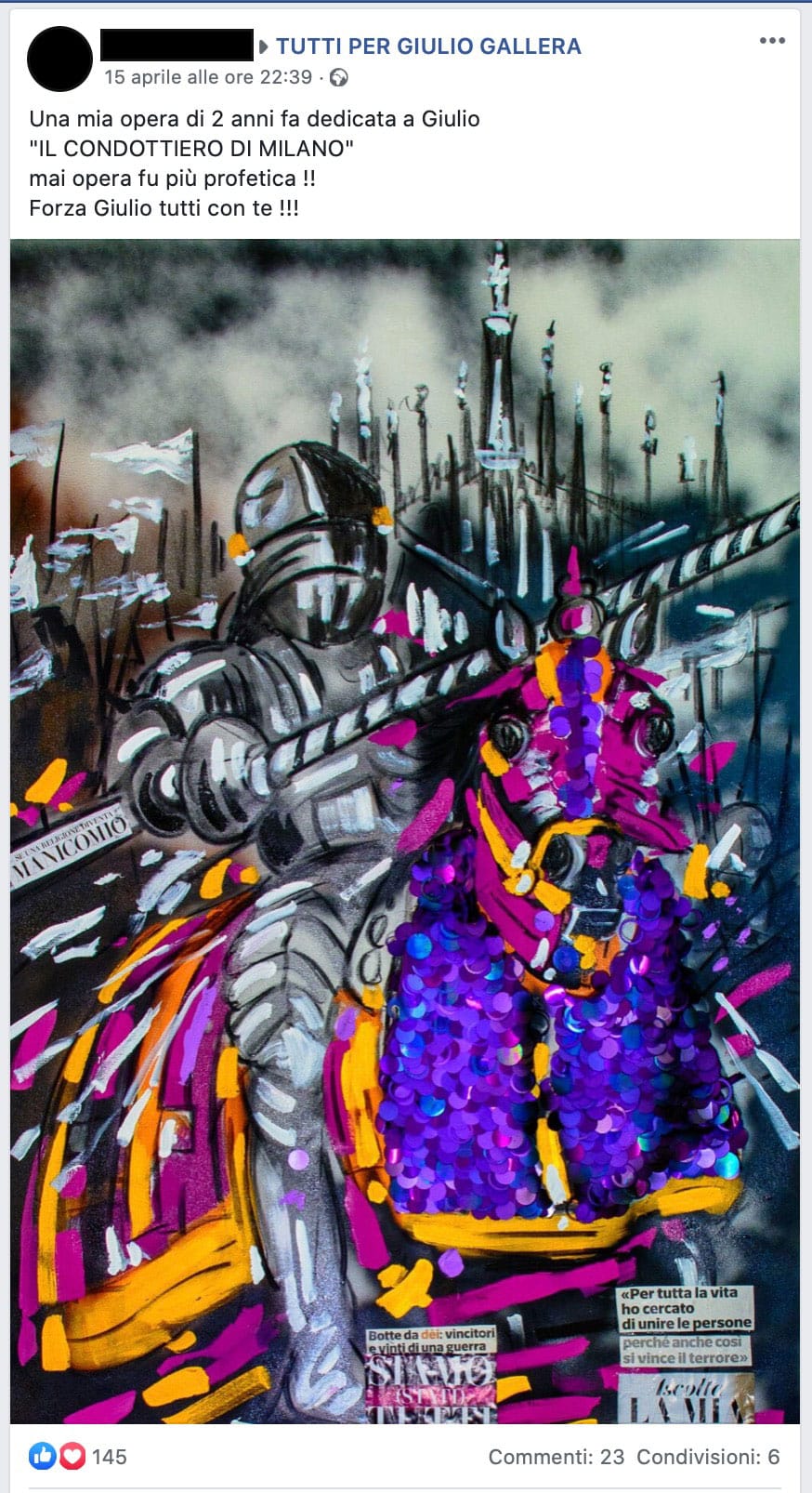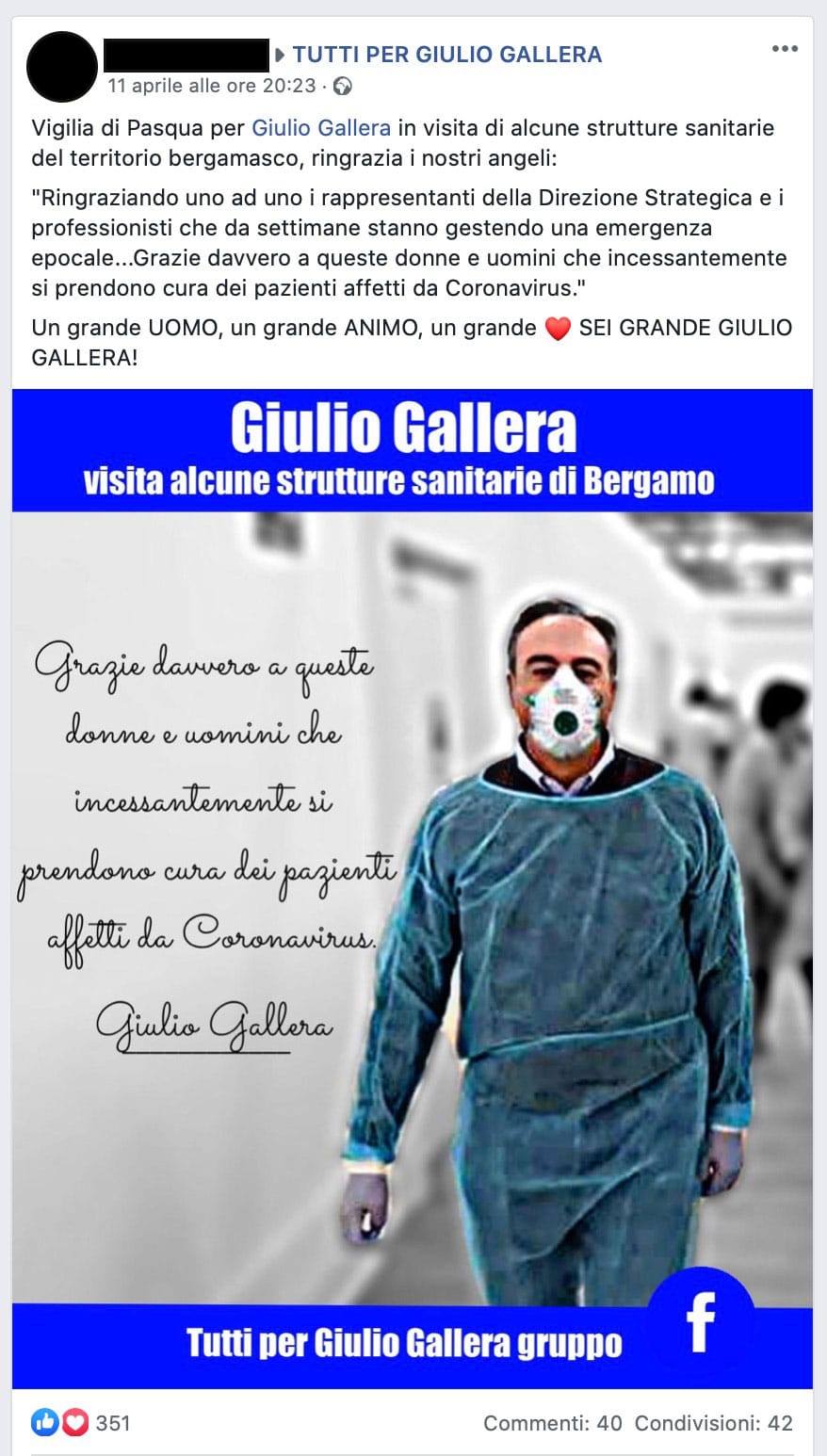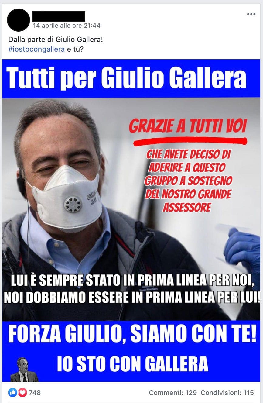 Sarà per questo che su Facebook è nato un gruppo dedicato esclusivamente alla lode dell’assessore: TUTTI PER GIULIO GALLERA, che al momento conta circa 4000 membri. Il gruppo ha lo scopo di “pubblicare tutti i contenuti riguardanti Giulio Gallera, dalle News, ai messaggi di sostegno e di vicinanza in questo particolare momento e a tutto ciò che può essere utile a supportarlo.” Le grafiche vanno dal classico gruppo preimpostato di destra al format “compleanno nordcoreano”: