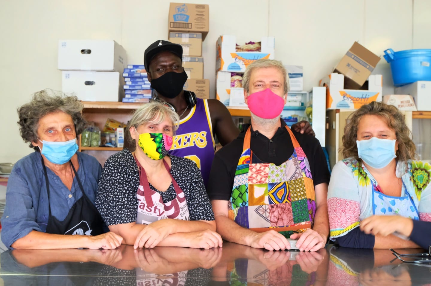 “Abbiamo contato una cinquantina di persone. Domenica scorsa ce n’era un centinaio, perché c’era il mercato dei produttori agricoli locali,” racconta Piero, che co-dirige la cucina con la sua mascherina rosa. Con lui c’è il gruppo cucina, che si è formato subito dopo l’occupazione. “All’inizio, nel vecchio Ri Make abbiamo deciso di fare un pranzo con un piatto per mangiare in compagnia.” Poi il gruppo è diventato “qualcosa in più,” e ha coinvolto i ragazzi di un centro di prima accoglienza per migranti e richiedenti asilo, che si avvicinano al lavoro attraverso la cucina, con l’associazione “Mshikamano.”
