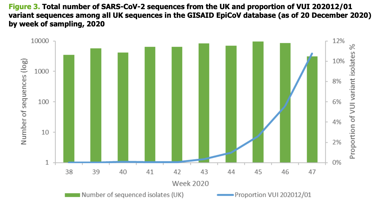 La proporzione della nuova variante VUI 202012/01 sul totale delle sequenze di SARS-CoV-2 isolate nel Regno Unito, da un brief dell’ECDC molto utile per approfondire.