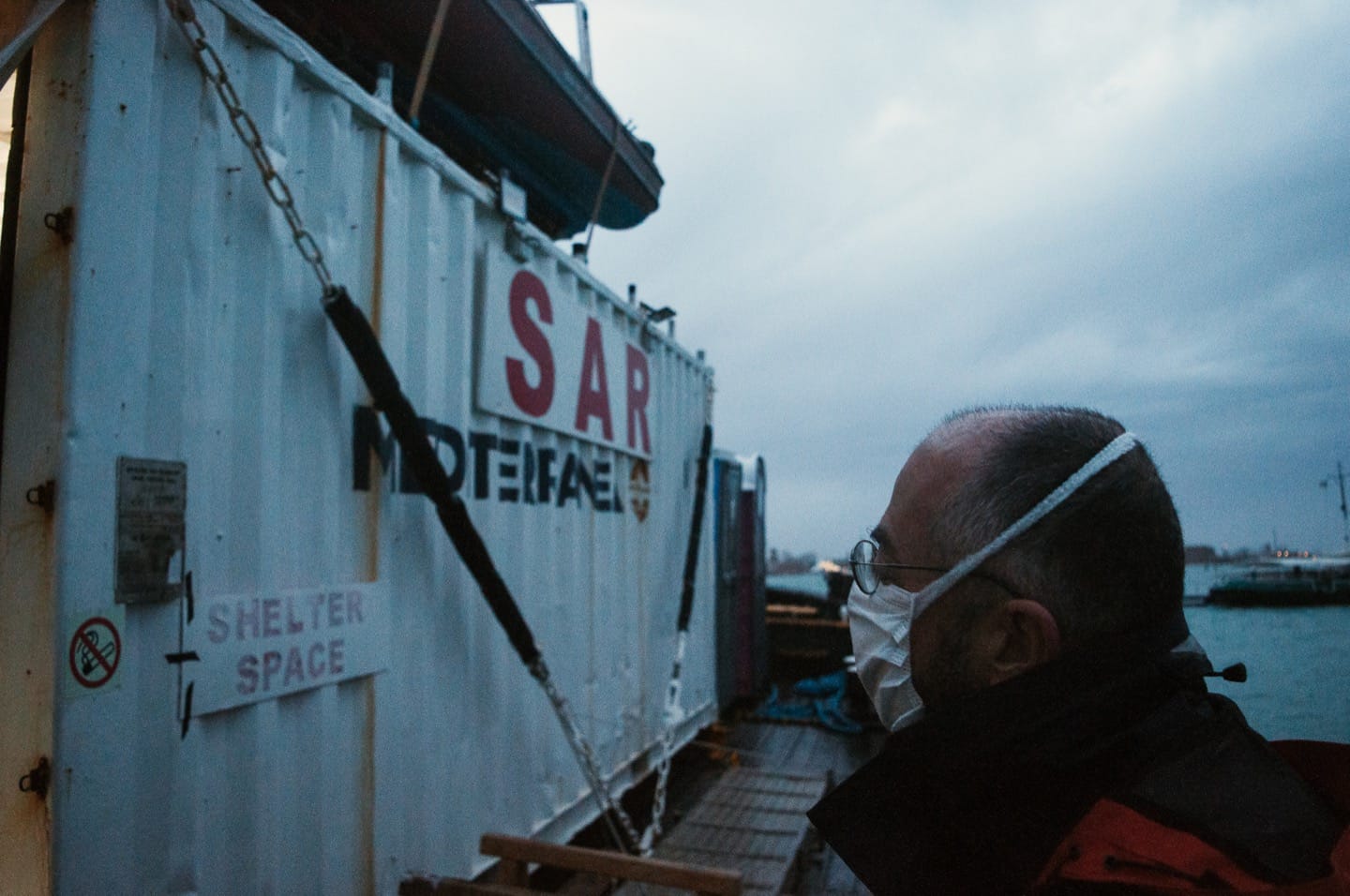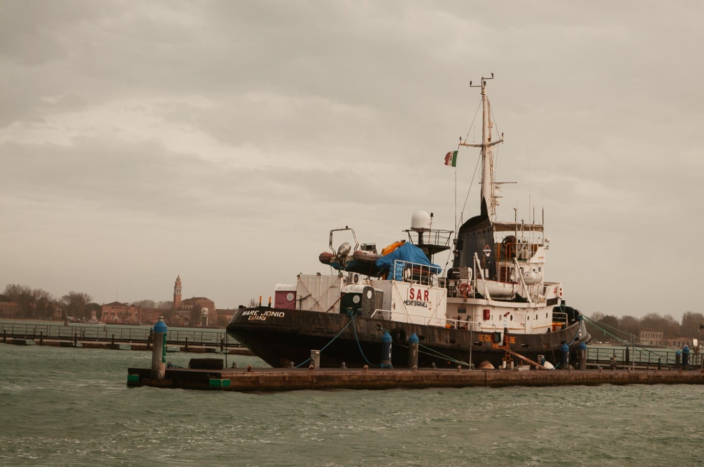È una giornata grigia e ventosa a Venezia. L’isola della Certosa si trova appena oltre la bocca di porto nord-orientale, da sempre l’entrata principale alla città. Arrivando in vaporetto, proprio accanto all’imbarcadero, salta all’occhio un rimorchiatore. Se è capitato di vederne la fotografia sulla prima pagina di un giornale, il primo pensiero sarà quasi certamente che nella realtà è più piccolo di quanto non sembri in foto. Si tratta di Mare Jonio, una delle imbarcazioni di Mediterranea, la piattaforma della società civile nata nel 2018 con l’obiettivo di organizzare un’attività testimonianza e denuncia in mare, ma soprattutto per salvare le vite dei migranti quotidianamente a rischio in acque nazionali e internazionali. Ad oggi gli esseri umani salvati dai volontari del team sono 374.