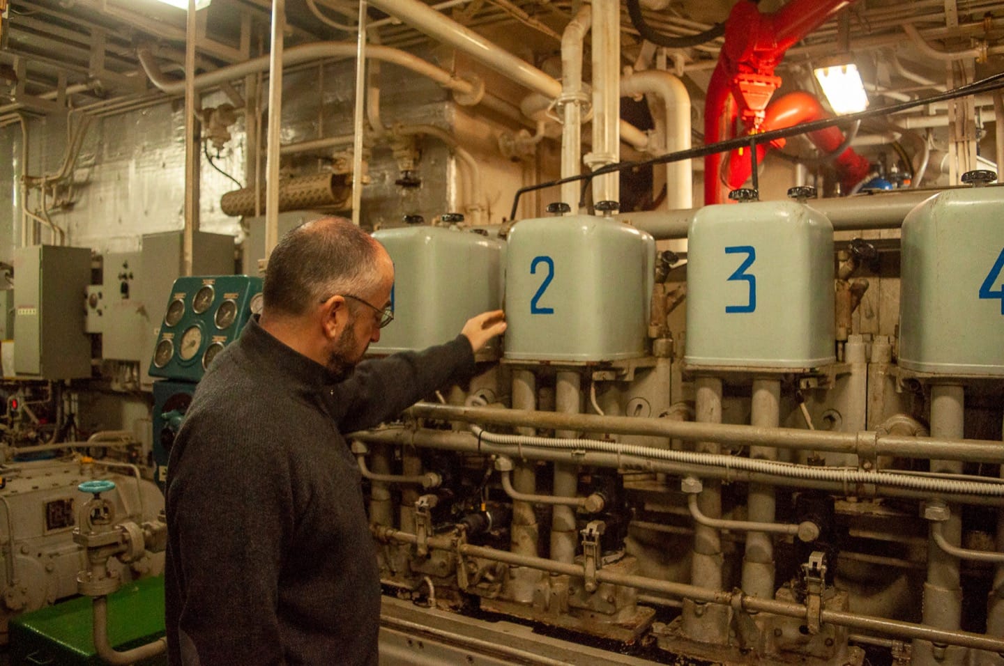 A bordo ci accoglie Monica, che ci offre un caffè e ci mostra la nave, che si trova ferma a Venezia da alcune settimane per lavori di manutenzione. Per essere manovrato, un rimorchiatore di queste dimensioni ha bisogno di un equipaggio di sette persone, a cui si aggiungono i volontari che si occupano dei salvataggi in mare. Scopro che per ragioni amministrative c’è bisogno di gestire a bordo due diverse cucine, due dispense, due farmacie, una per l’equipaggio e una per gli ospiti. Gli spazi sono minimi ma bene organizzati.