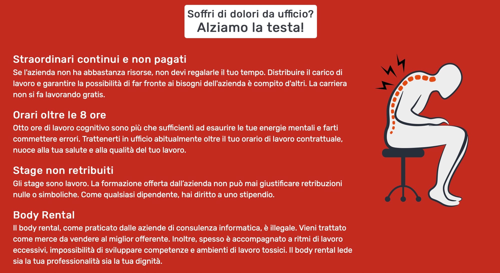 Così, fare educazione diventa una delle prime cose da fare — un passo necessario, ma non sufficiente. Tra i cavalli di battaglia c’è la lotta agli abusi che tengono bassi i salari — in primis il body rental, pratica illegale in cui una figura professionale viene assunta da un’azienda che svolge un ruolo di intermediazione, “prestando” il lavoratore a un’azienda committente per dei progetti specifici. La pratica permette alle aziende terze di tagliare i costi di gestione della manodopera ed evitare responsabilità — regalando in cambio ritmi di lavoro insostenibili e serie conseguenze psicofisiche. Altrettanto problematico è il mondo della grande consulenza, in cui i professionisti sono sistematicamente incaricati di fornire uno specifico servizio in autonomia, con know-how e mezzi propri — assorbendo, come fa notare TWC, “competenze, bandi e appalti senza investire nulla sul territorio, soffocando la nascita di un tessuto produttivo sano.”