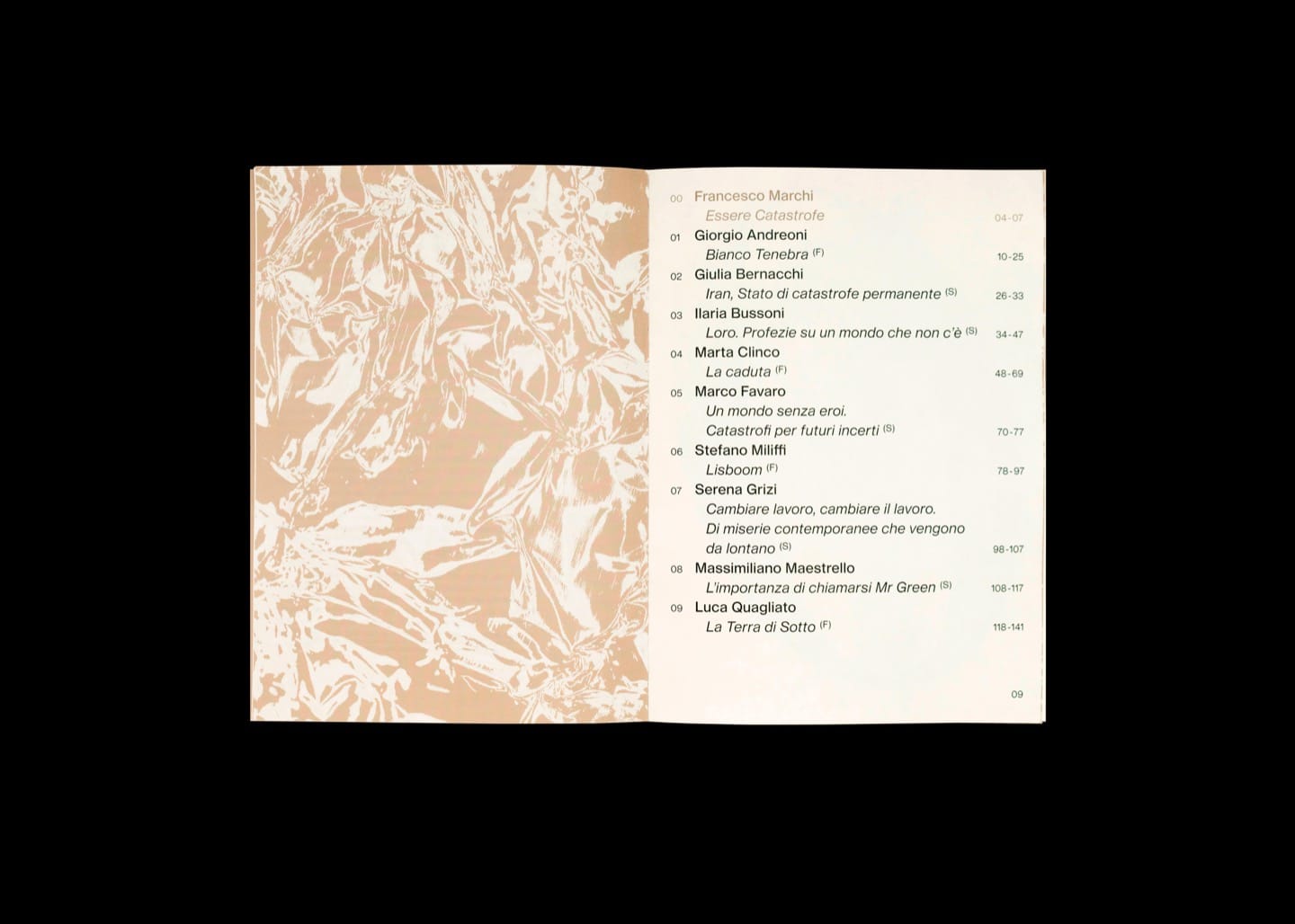 Essere Catastrofe è un numero composto da 5 progetti testuali e 4 fotografici che toccano diverse tematiche: dall’inquinamento della Pianura Padana alla precarietà lavorativa, passando per considerazioni di stampo più filosofico in merito al rapporto tra uomo, natura e “fine dei mondi”.