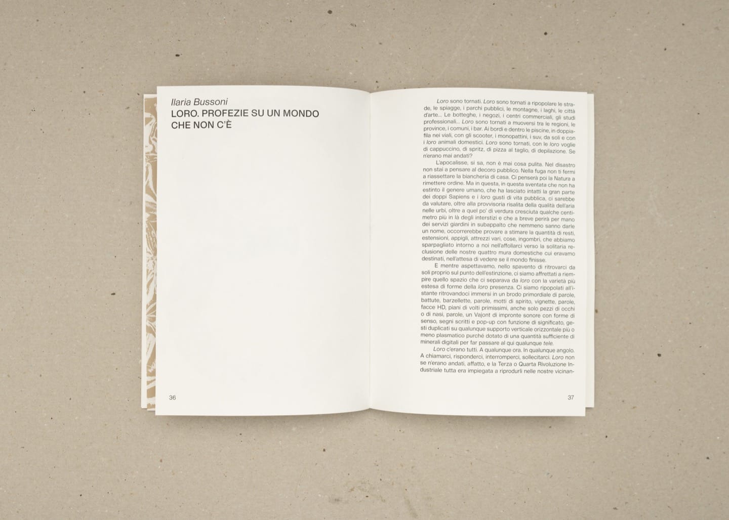Il volume si presenta in un formato di 18x25cm, rilegato a filo refe con dorso a vista e stampato – coerentemente con alcuni dei temi affrontati – su carte Favini riciclate, riciclabili ed ecologiche. Una sovraccoperta fotografica avvolge l’intero progetto stampato in una tiratura di 100 pezzi.