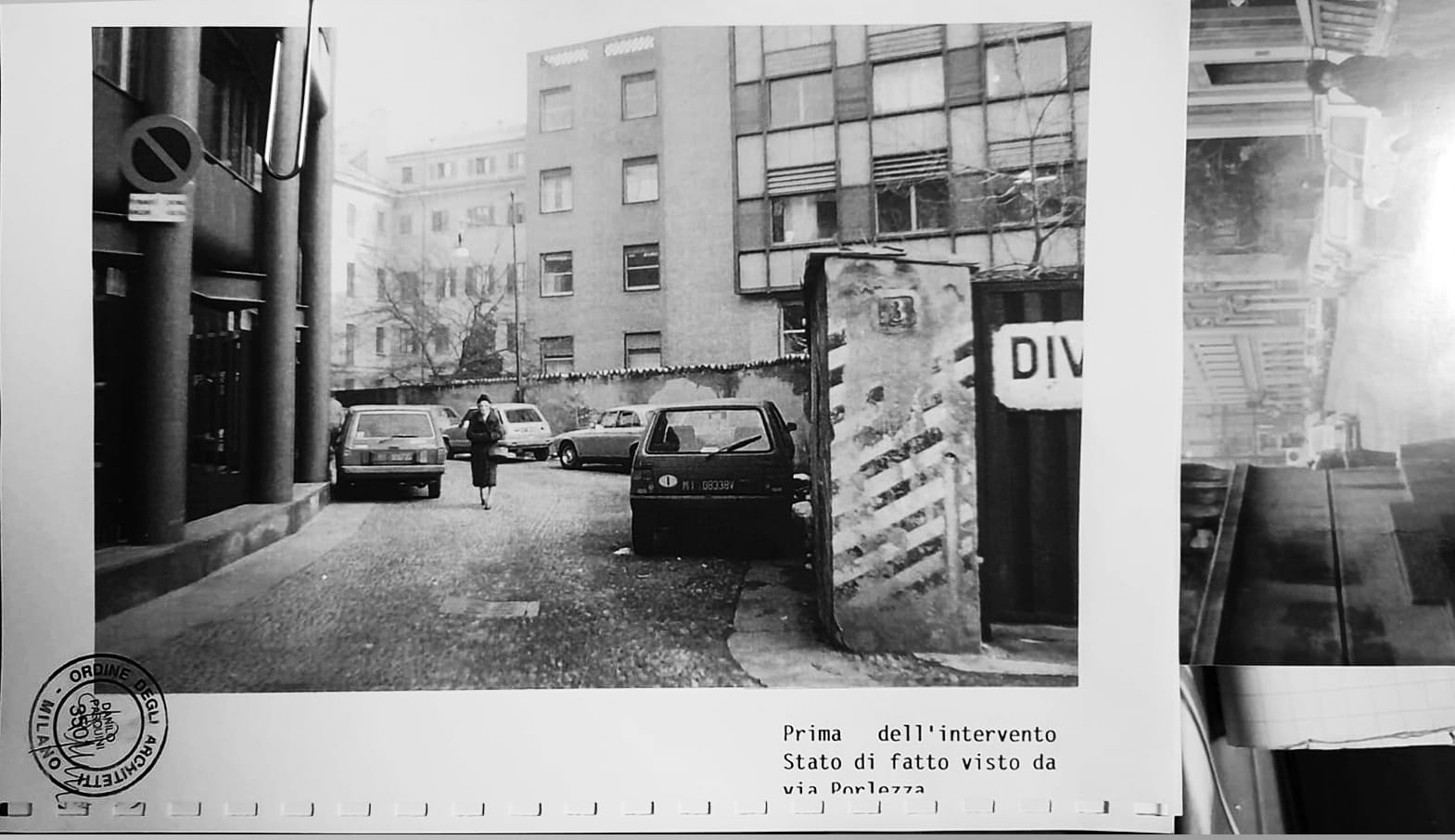 In questo nuovo scenario si colloca il progetto e la costruzione dell’anfiteatro Porlezza a Milano, luogo insolito travestito da luogo qualunque in pieno centro, pensato come luogo di condivisione all’aperto in una zona in cui i luoghi della cultura, anche fuori dai salotti, erano chiusi e delimitati: “Incrementare la possibilità d’incontri culturali mi veniva da un’esperienza basata sulla necessità della diffusione della cultura nelle periferie di Milano, esperienza che fu esercitata personalmente nei primi anni ’70 in collaborazione con il Piccolo Teatro di Paolo Grassi, il Comune, i Consigli di Zona (oggi Municipi) con una forma di spettacolazione itinerante detta Teatro Quartiere che veniva ospitato dalla famiglia Medini sotto il proprio tendone in diversi quartieri della città,” continua l’Architetto Pasquini che, riguardo il suo progetto in parte controtendenza in una Milano che voleva con ogni forza guardare al futuro piuttosto che al passato, conclude: “La scelta di costruire in quel luogo un anfiteatro mi venne dall’esame della storia della città e della presenza, in prossimità nell’area a sud occupata oggi dalla Borsa, del Teatro Romano, all’epoca della Milano capitale dell’Impero Romano, dal 300 al 400 d.C.”