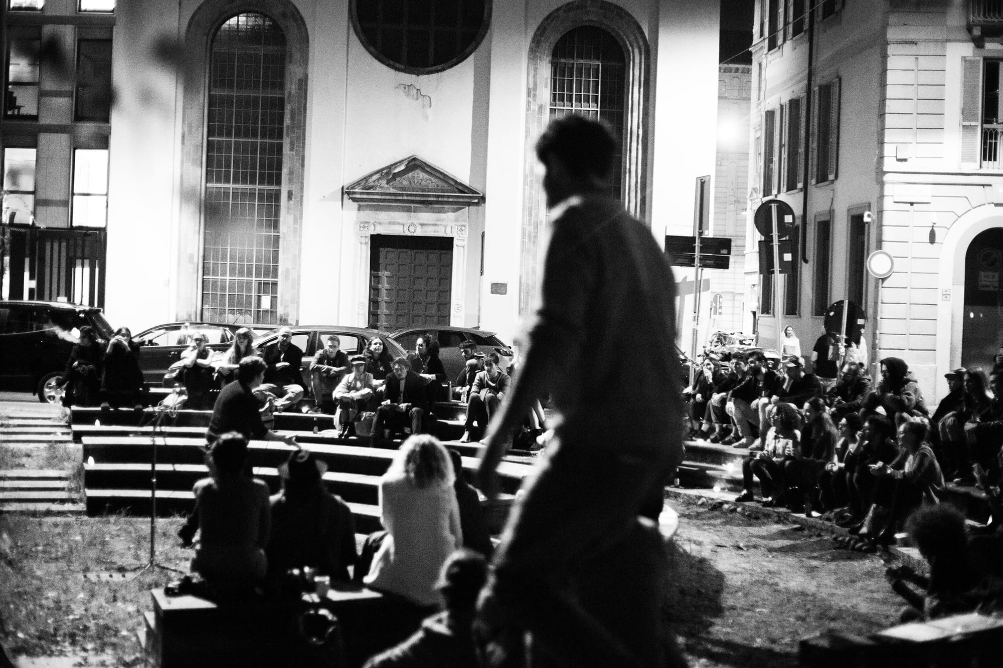 “Diverse volte ci siamo appoggiati al magnifico anfiteatro di via Porlezza,” racconta Paolo Cerruto, tra i fondatori del collettivo, “un piccolo gioiello di senso e partecipazione nella desolazione urbanistica, a livello di socialità notturna, del centro città. L’acustica perfetta amplificava la voce di chi parlava al centro della scena, permettendo di sentire bene da qualsiasi angolazione. Dalle finestre circostanti, anche quando finivamo a mezzanotte, non è mai arrivata alcuna lamentela. Abbiamo chiesto spiegazioni al Comune in merito alla demolizione, interpellato anche tramite PEC spedite da un avvocato, e dopo due settimane non abbiamo ancora ricevuto alcuna risposta. Il progetto presentato da Maran prevede un’anonima piazzetta con due alberi e panchine, che dice co-progettata insieme ai residenti: ma quelli incontrati durante i nostri presidi davanti al cantiere della demolizione erano ignari e dispiaciuti. Ci piacerebbe avere un confronto con i fautori della distruzione, per spiegar loro le nostre ragioni e condividere una riflessione su uno spazio che è di tutti i cittadini. Vogliamo che il nuovo progetto venga messo in discussione e che vengano prese in considerazione le nostre voci, quella dell’architetto che costruì questo spazio e quelle di nuovi architetti e urbanisti che su questo luogo hanno ideato progetti di restauro e rigenerazione all’avanguardia, con grande attenzione al contesto. Chiediamo un nuovo anfiteatro che permetta alla cittadinanza di organizzare eventi culturali dal basso, all’aperto. Vogliamo più spazi disegnati per unirci e condividere esperienze al di fuori del consumo, esigiamo che la città ci offra piazze come spazi di confronto ed espressione.” Tempi diVersi sta lavorando in queste settimane a un documentario video, un montaggio dei due presidi organizzati a seguito della demolizione in via Porlezza, cui hanno partecipato dando il proprio sostegno lo scrittore Antonio Moresco, l’attore e regista Gigi Gherzi, Victor Veronesi, storico dell’arte, e lo stesso architetto Pasquini, oltre ad alcuni membri del collettivo.