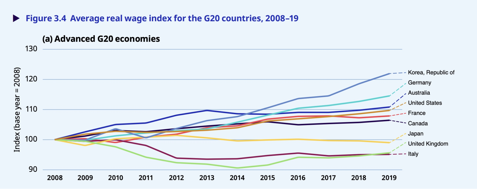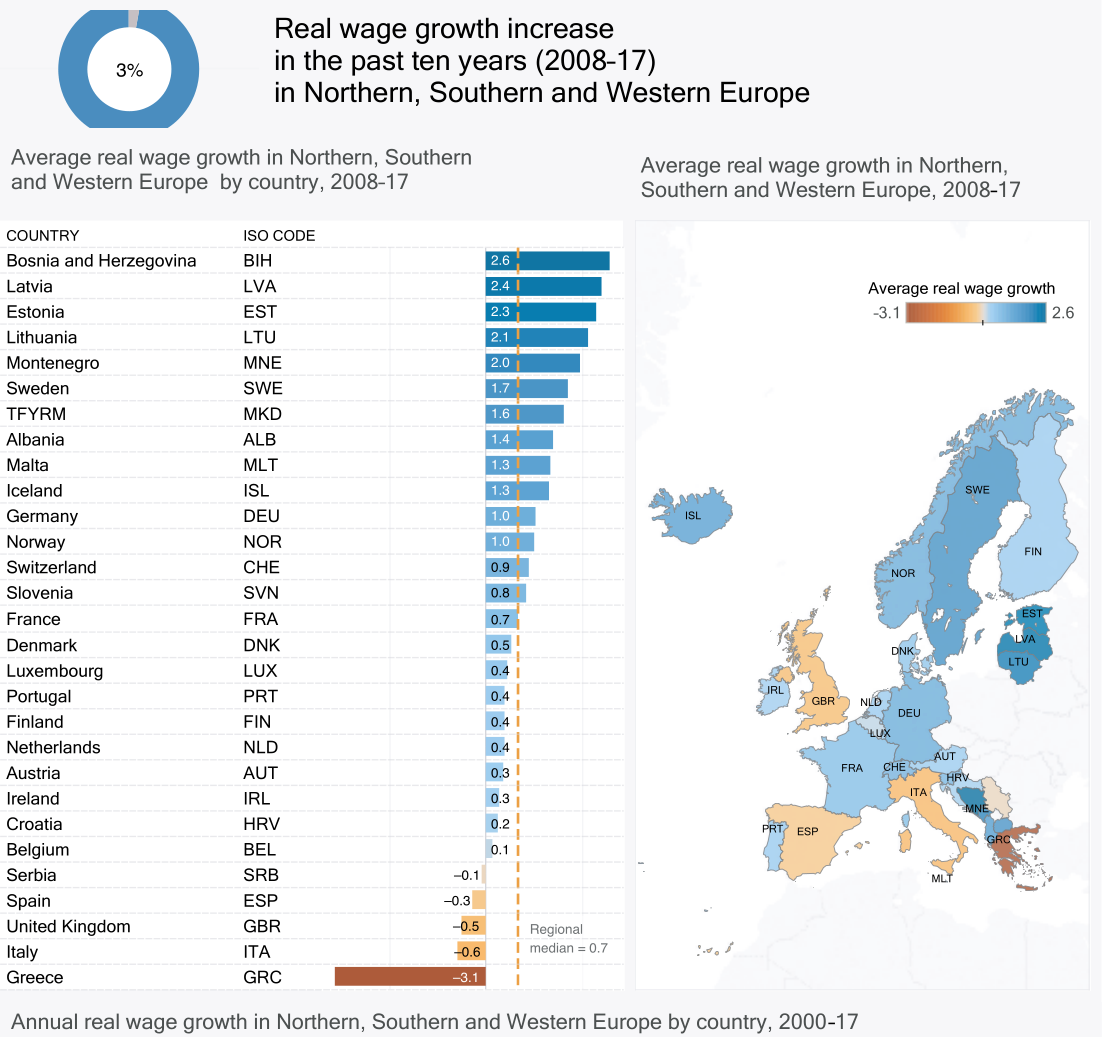 I possibili spunti di discussione sui salari in Italia in realtà vanno molto oltre quelli sul salario minimo. È interessante notare che nel corso degli ultimi quindici anni nel nostro paese sono scesi, rispetto alla media degli altri paesi Ue, anche i salari medi. Secondo dati dell’International Labour Organization, tra il 2000 e il 2017 gli stipendi reali in Italia sono diminuiti dello 0,5% — mentre, ad esempio, in Francia sono aumentati dello 0,7% e in Germania dell’1%.