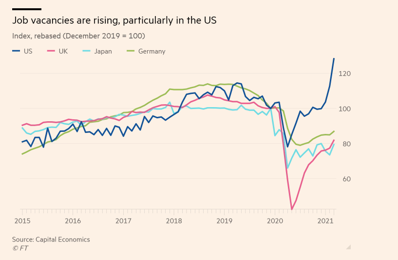 Questo vale, nel piccolo, in Italia ma più in generale in tutto l’Occidente. Negli Stati Uniti, UK, Germania e Giappone l’indice che calcola il numero di offerte di lavoro segnala una forte crescita. In particolare, la CNN arriva a scrivere che negli USA “si assume come mai prima d’ora.” Il commento è relativo agli ultimi dati – di aprile – diffusi dal Bureau of Labor Statistics: in un mese sono state create 9,3 milioni di nuove posizioni vacanti, rispetto agli 8,3 milioni attesi. Si tratta del dato più alto dal dicembre del 2000, quando è iniziato il monitoraggio. Eppure, malgrado sempre più aziende cerchino lavoratori, le imprese americane hanno assunto “solo” 6,1 milioni di persone ad aprile, lasciando scoperti milioni di posti.