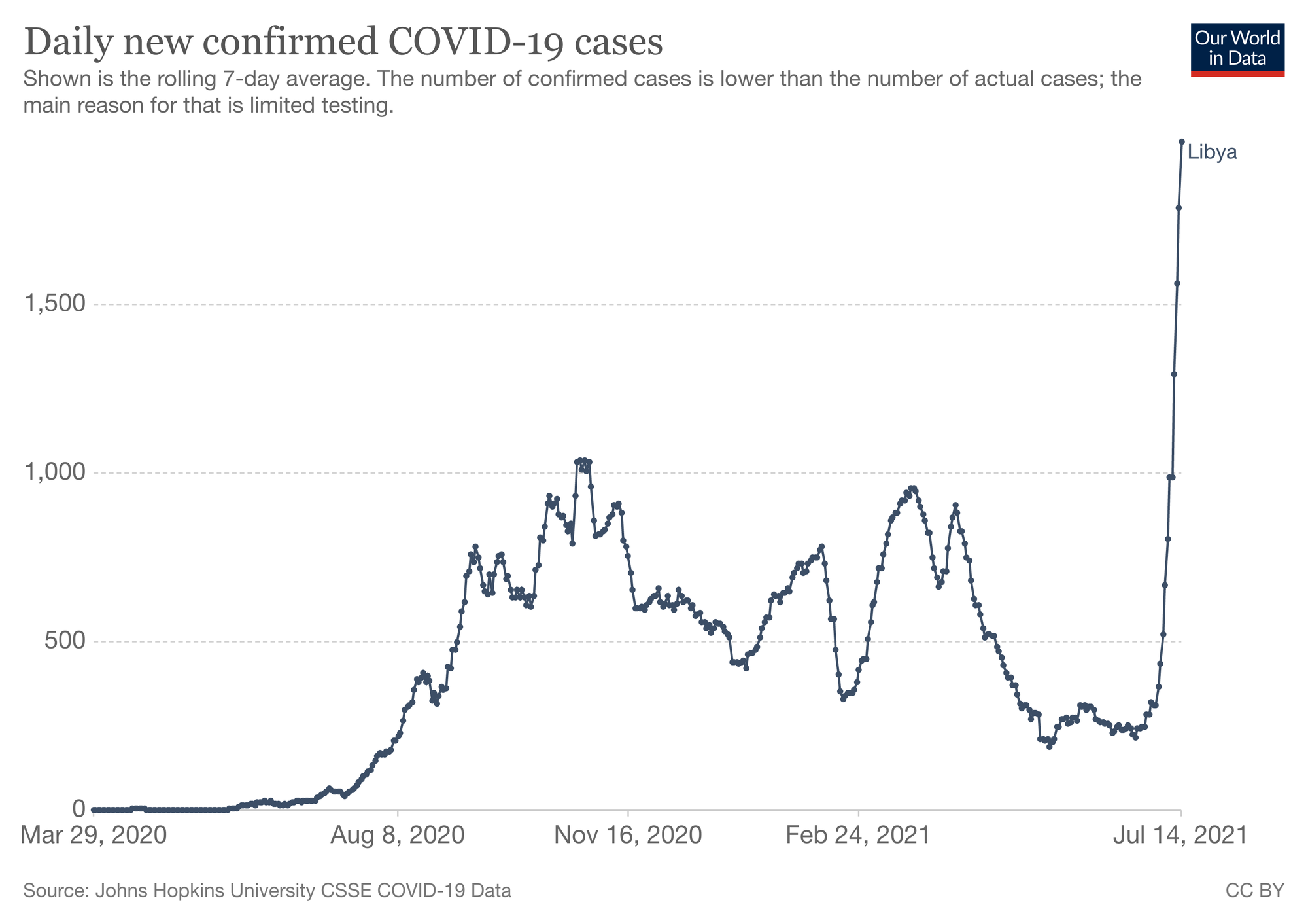 In Libia la curva del contagio è pressoché verticale, registrando una salita allarmante: nella settimana del 20 giugno la media giornaliera era di 246 casi — ieri erano 2.555. Nel paese è stata confermata la circolazione di varianti Alfa e Beta, e si sospetta che l’accelerazione sia causata dalla presente anche di Delta, che è stata confermata nei paesi confinanti. Il paese ha chiuso i confini con la Tunisia, e i livelli di vaccinazione sono bassissimi: si parla del 5,6% della popolazione — di 6,8 milioni di persone — tutti solo parzialmente vaccinati.
