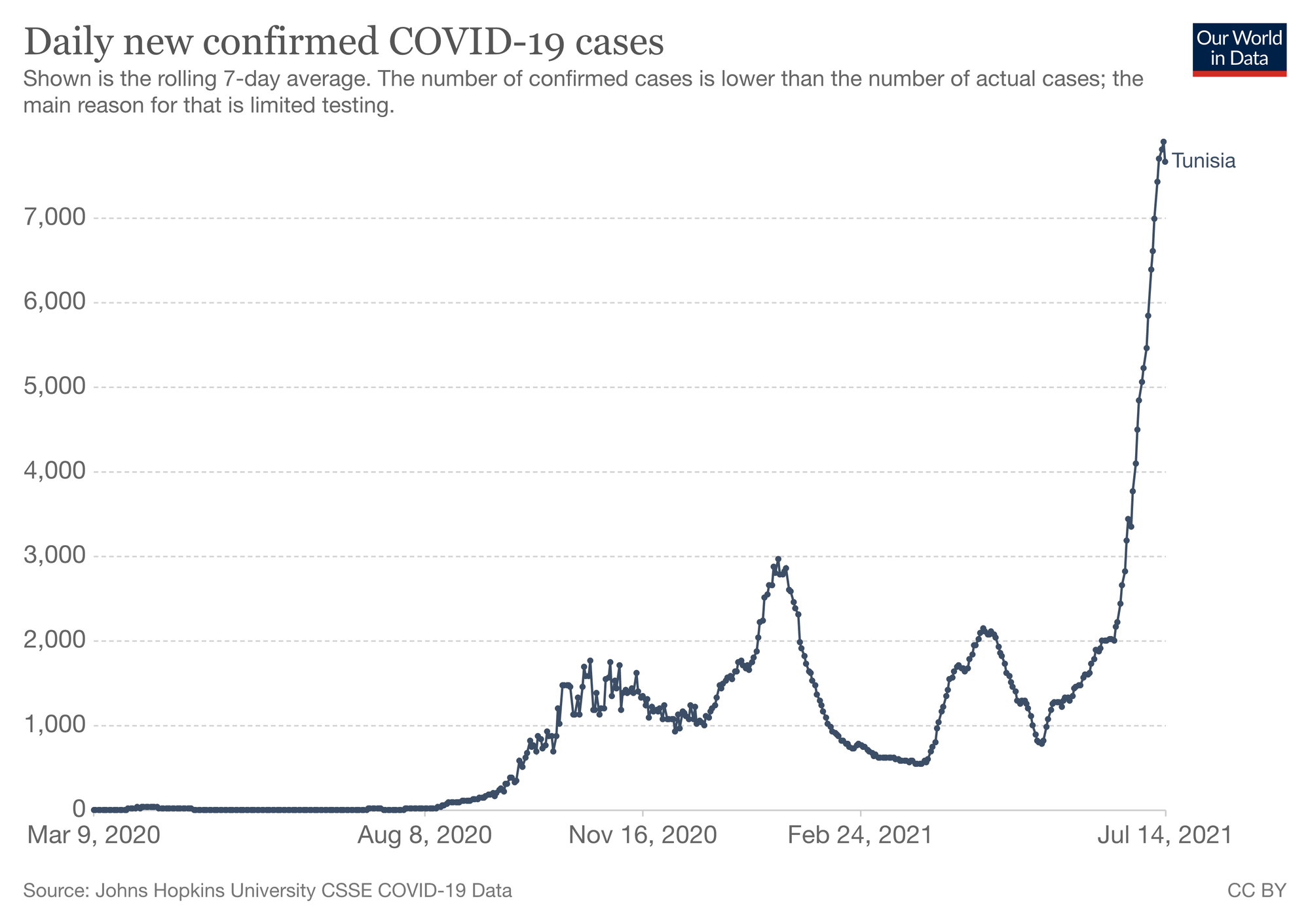 L’OMS sottolinea come la situazione sia particolarmente grave soprattutto in Tunisia. Il paese ha in questo momento il tasso di mortalità più alto di tutta la regione, e il numero di casi si attesta tra gli 8.000 e i 9.500 positivi al giorno. Dall’inizio del mese il numero quotidiano di morti è quasi raddoppiato: 106 persone il 1° luglio, 194 ieri. La copertura vaccinale resta bassissima, con solo il 6% degli abitanti completamente vaccinato — circa 750 mila persone. I posti in terapia intensiva sono occupati al 95% — uno scenario che porterà presto ad un aumento drastico del numero di morti. Il paese sta ricevendo importanti sostegni internazionale dal Marocco e dalla Francia, ma nonostante le donazioni di vaccini — 3,3 milioni di dosi che dovrebbero arrivare da Francia, Arabia Saudita, e Stati Uniti — non ci sono abbastanza dosi per coprire tutti i 11,6 milioni di abitanti.