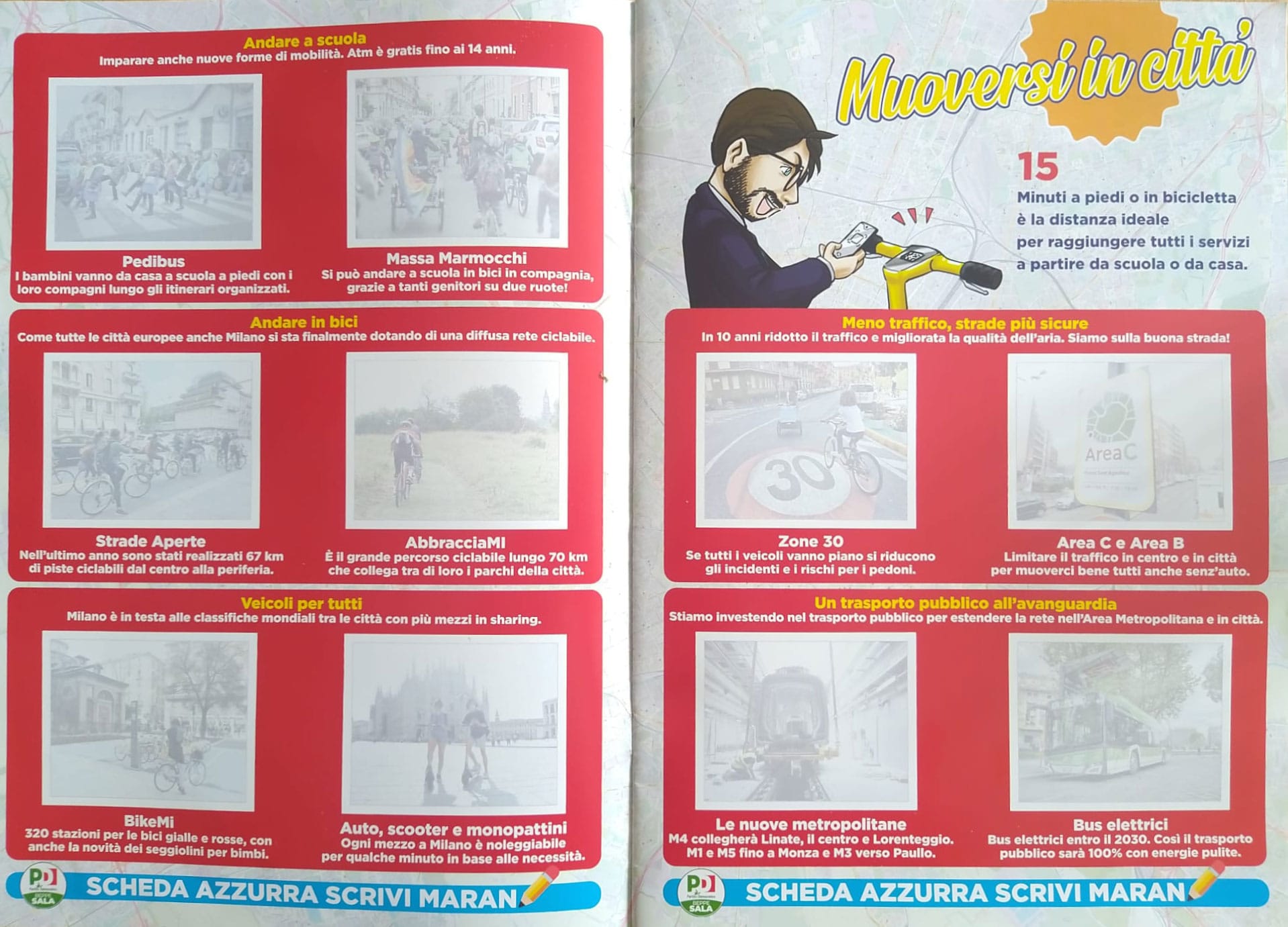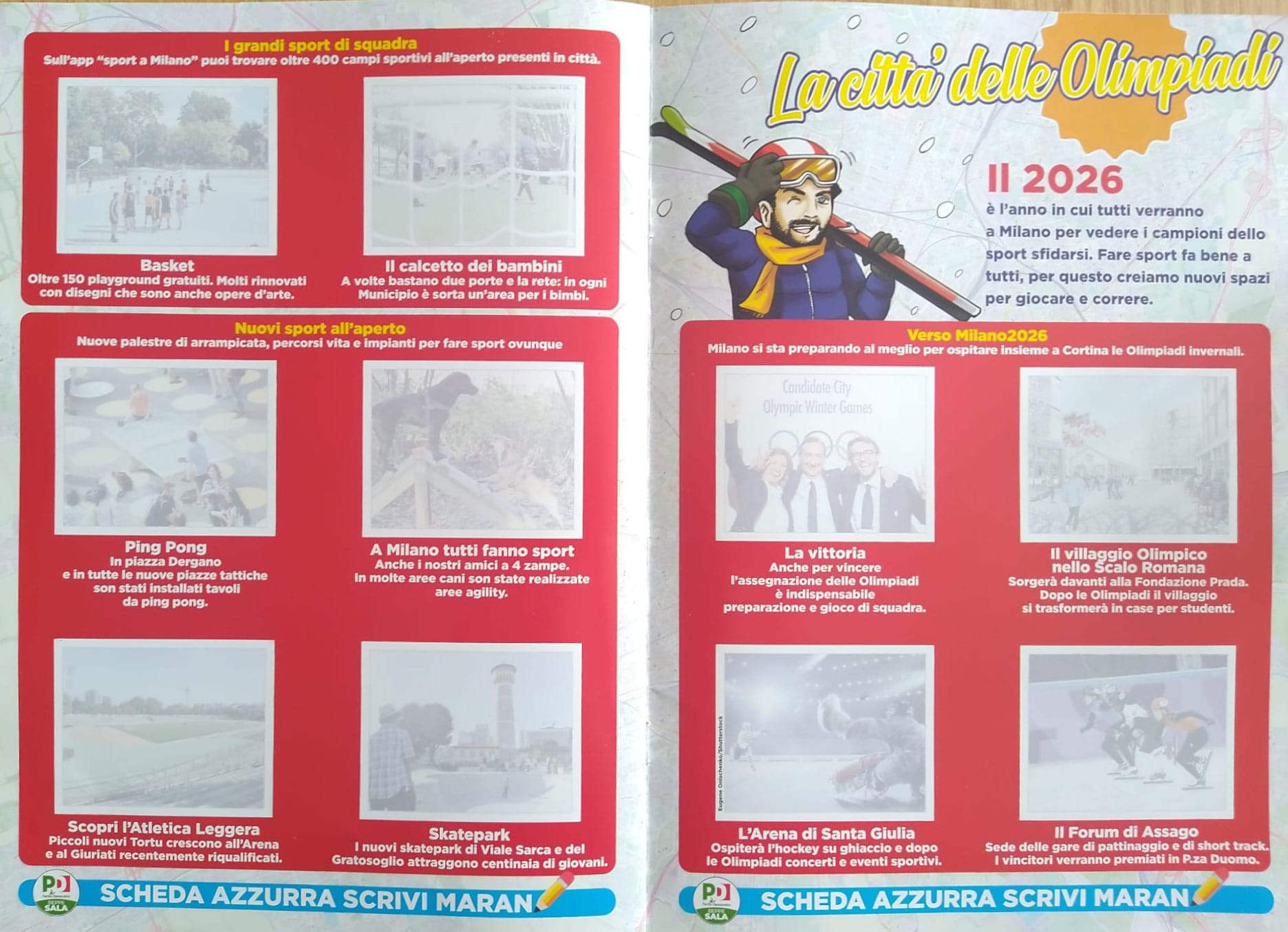 Tornando alle amministrative 2021, ci accorgiamo che l’idea di creare propaganda “per tutta la famiglia” ha fatto scuola perché Pierfrancesco Maran, assessore del comune di Milano con deleghe all’urbanistica, verde e agricoltura, ha messo a disposizione dei cittadini un album di figurine dedicato a lui e ai progetti urbanistici in cantiere per la Milano futura. Tutto l’album è puntellato da continui banner che ricordano ai genitori distratti come votare e per chi, mentre la grafica è un ibrido tra libro delle vacanze con inserti cartoon e raccolta punti del supermercato, con fotografie poco ambiziose di paesaggi urbani al posto dei prodotti.