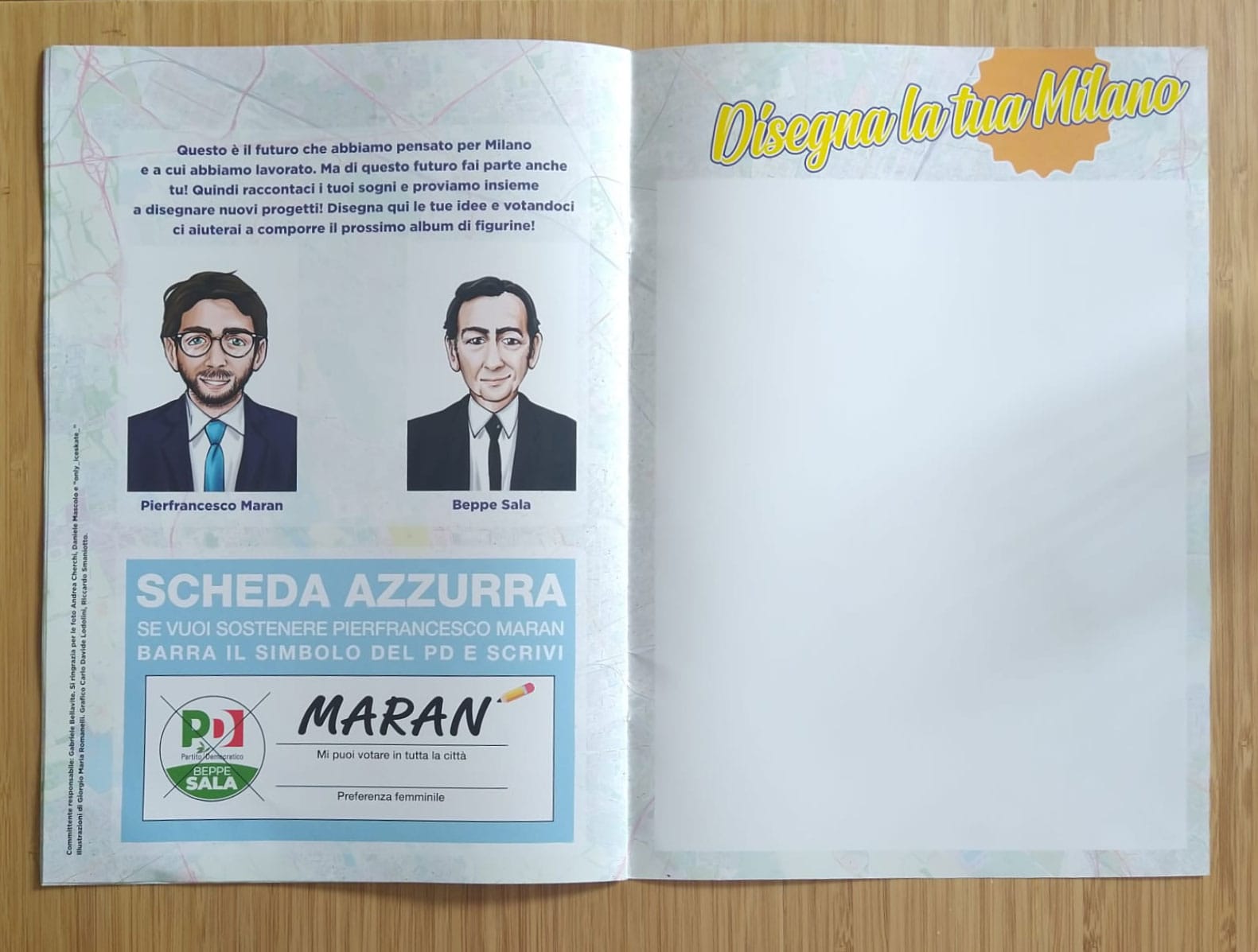 Il tutto si chiude con una pagina bianca che invita a disegnare “la tua Milano”, con la riproduzione della scheda elettorale e le fototessere cartoonizzate di Maran e Beppe Sala — che in questa versione assomiglia moltissimo a Corrado Augias ai tempi di Telefono Giallo.