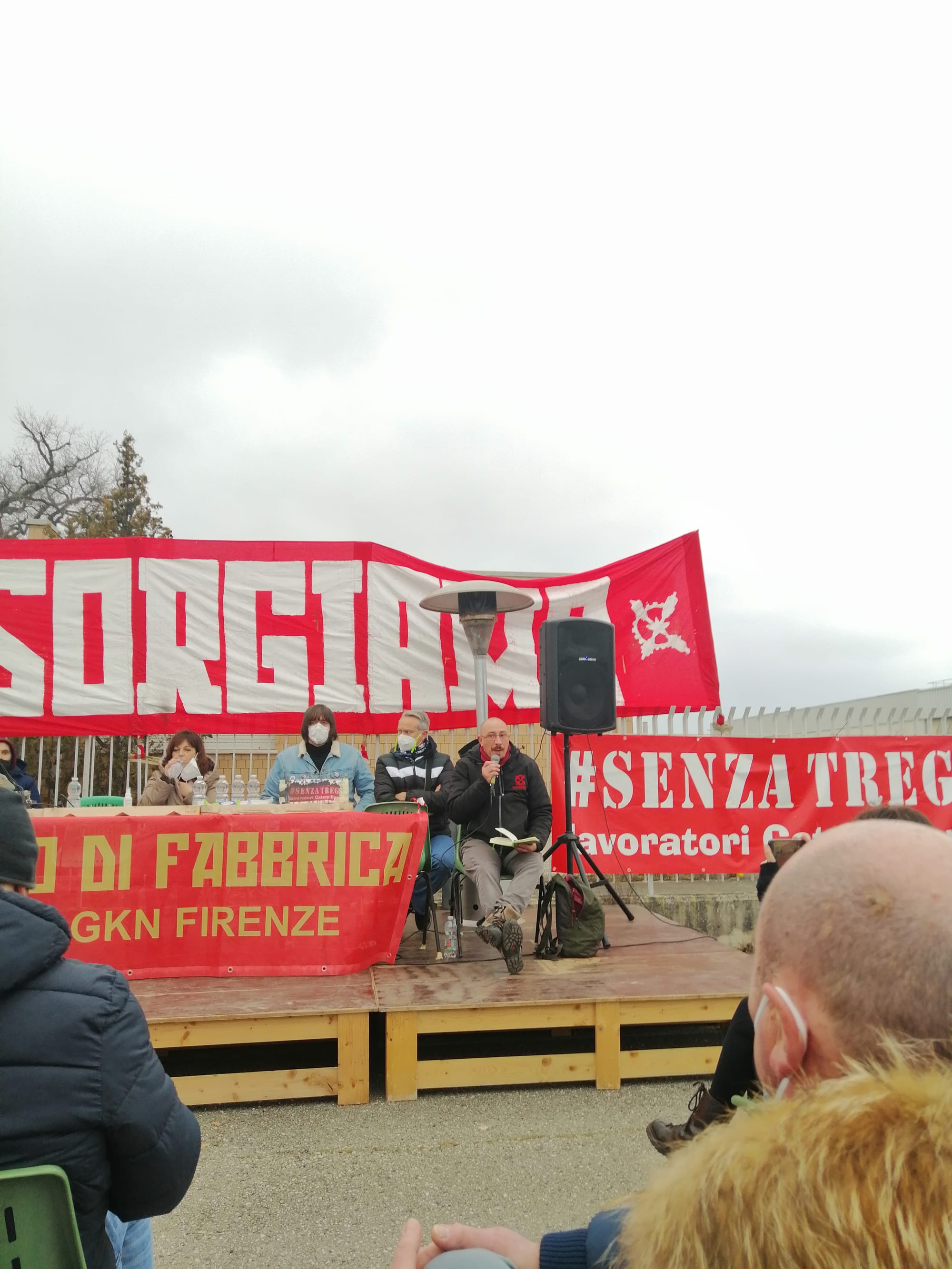 Sopra il palco, davanti ai cancelli dello stabilimento, campeggiava uno striscione rosso con la scritta bianca “Insorgiamo!.” Al suo fianco c’era un altro cartello, con il motto “senza tregua.” Durante l’assemblea dei lavoratori aperta alla cittadinanza, Matteo Moretti della Rsu GKN ha ricordato che la fabbrica di Campi Bisenzio è ciò che rimane dell’automotive nel fiorentino: “Siamo a guardia di una storia industriale. Le istituzioni sapevano della pericolosità del fondo finanziario che aveva acquistato lo stabilimento. Ma dopo un po’ l’impotenza diventa complicità.”