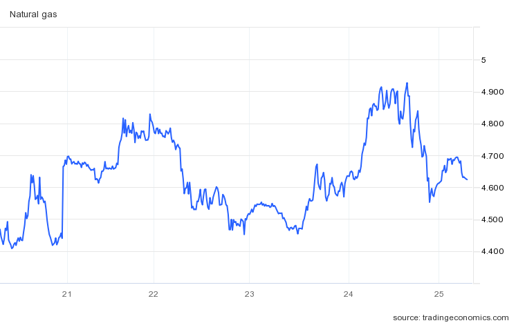 Andamento settimanale del prezzo del gas naturale, grafico via Trading Economics