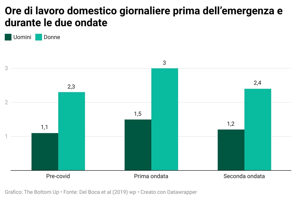 Le misure di contenimento della pandemia, in particolare le chiusure prolungate di scuole e asili, hanno provocato l’aggravarsi dei carichi di cura, che sono ricaduti prevalentemente sulle donne, in misura maggiore in quei Paesi dove gli stereotipi di genere sono ancora forti e l’occupazione femminile è più bassa: in Italia il 74% del lavoro di cura quotidiano è stato svolto dalle donne, in Portogallo l’80%, in Danimarca il 57%. Come fa notare Paola Profeta, “in quei Paesi dove l’occupazione femminile è più alta le scuole sono state chiuse per meno tempo, perché sarebbe stato più complicato. Da noi si dà sempre per scontato che tanto una donna che si occupi dei figli da qualche parte c’è.”