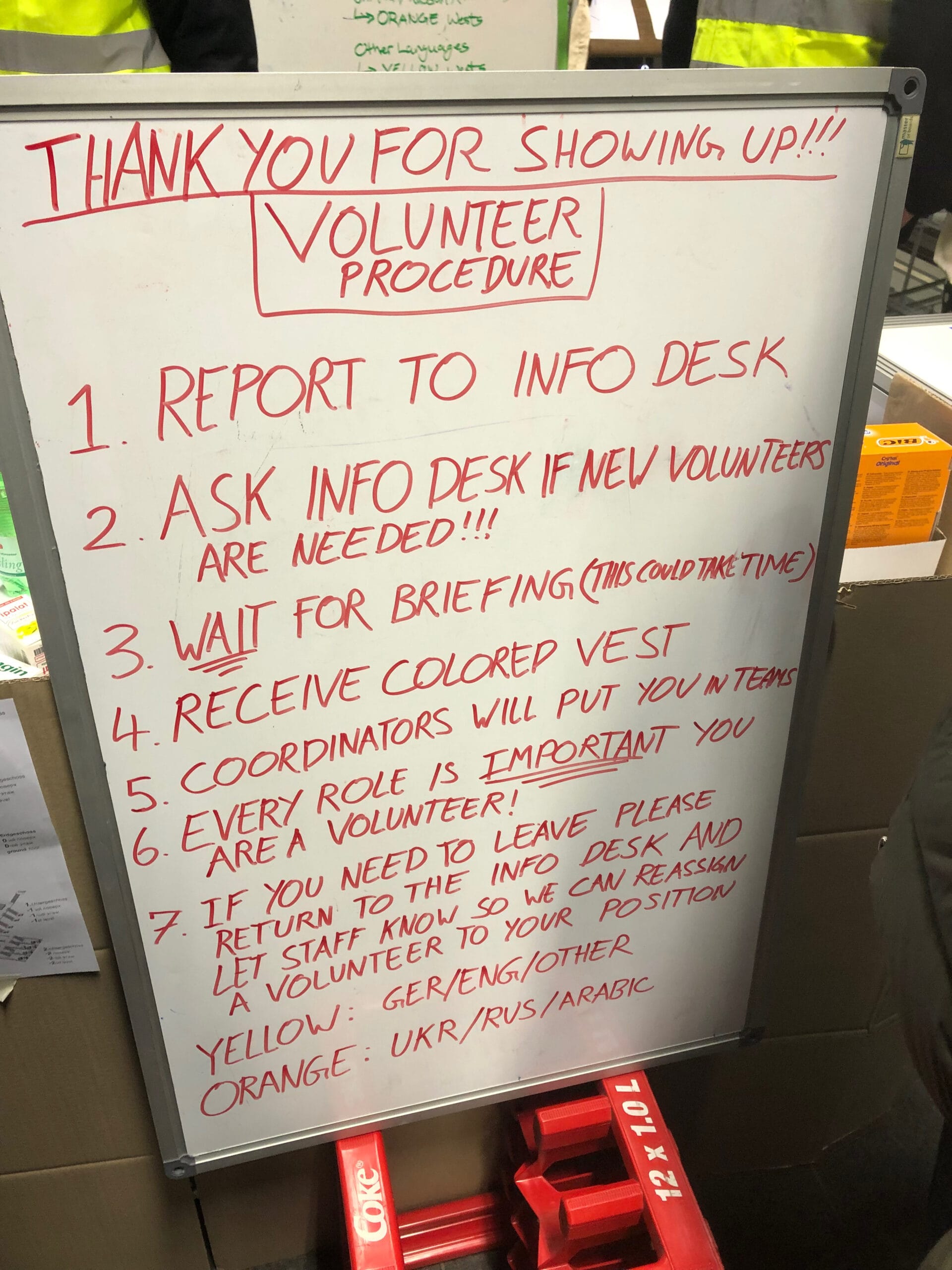 Le comunicazioni passano attraverso amministratori e amministratrici della chat. I messaggi variano da strettamente pratici — “SERVE URGENTEMENTE INTERPRETE LINGUA DEI SEGNI A ZOB [Stazione Centrale dei bus]. POSSIAMO MANDARE MACCHINA” —, a motivazionali — “Grazie a volontari e volontarie della Food Station per tutti gli sforzi di questi giorni!” — a veri e propri avvertimenti — “Attenzione! Stando ai report della Polizia, ci sono persone che avvicinano i nostri volontari e altri passanti e offrono loro denaro per accogliere giovani donne e/o bambini.” Quest’ultima è una criticità ben presente agli occhi di organizzatori e organizzatrici, che a ogni briefing invitano volontari e volontarie a tenere sott’occhio i civili non registrati che si presentano spontaneamente ai binari per offrire alloggio a nuovi arrivati e arrivate. L’imperativo è riportare immediatamente alla Polizia qualsiasi situazione sospetta.