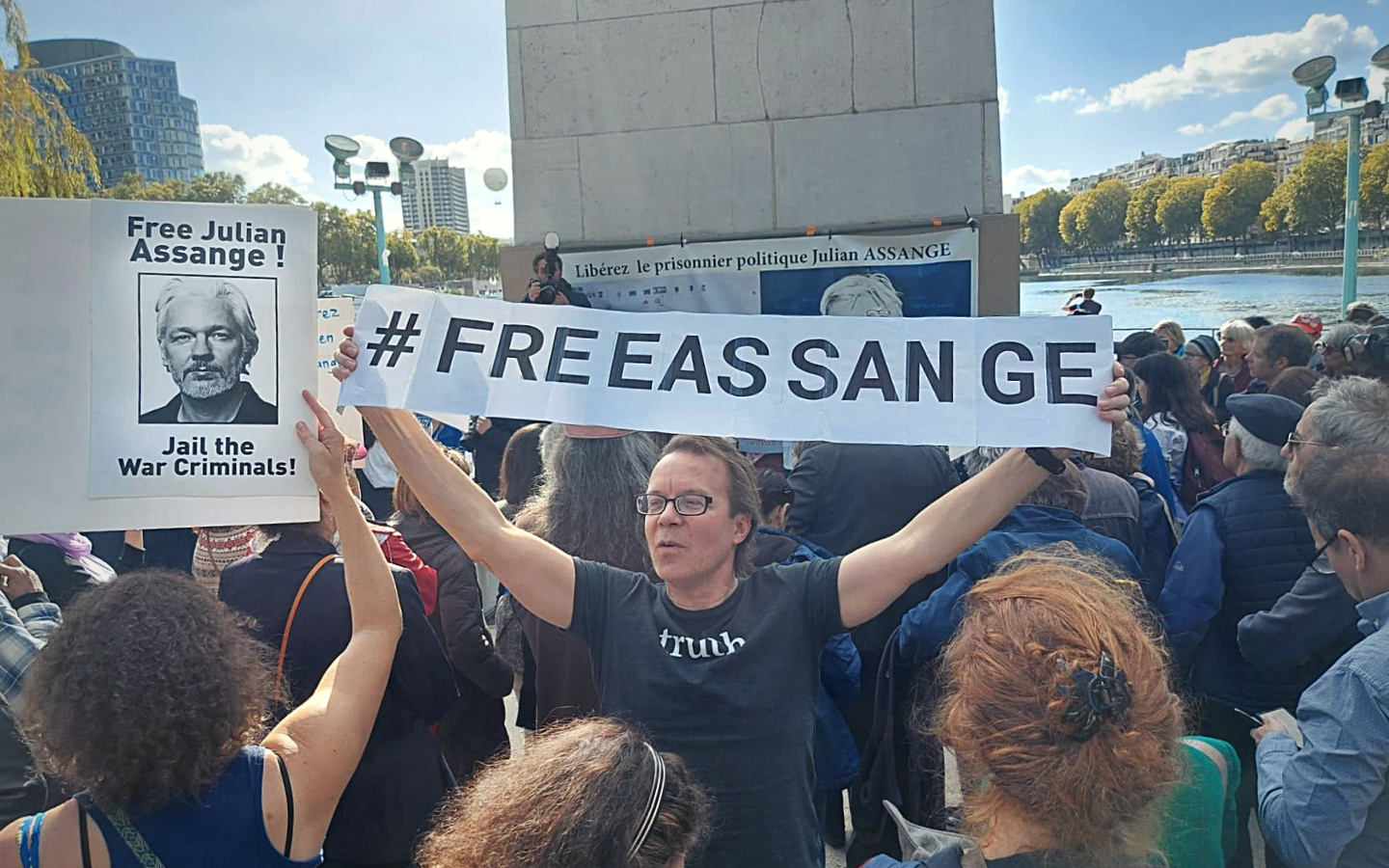 La statua della libertà si staglia maestosa contro un cielo limpido, nel suo tipico verde acqua di bronzo ossidato. A dispetto di ogni apparenza, non siamo a New York, ma a Parigi. Ai piedi della copia molto più modesta della celebre statua newyorkese, sabato 8 ottobre decine di persone si sono radunate per protestare contro l’estradizione di Julian Assange negli Stati Uniti. “Il giornalismo non è un crimine”, e “Liberate Assange, incarcerate i criminali di guerra” recitano alcuni tra i cartelloni.