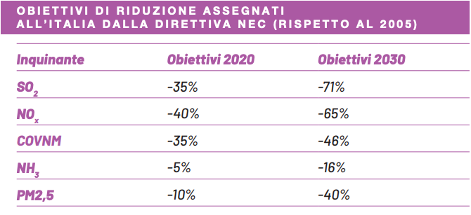 L’Italia, in base al Programma nazionale di controllo dell’inquinamento atmosferico, che recepisce una direttiva europea del 2016, è impegnata a ridurre fortemente gli inquinanti rispetto ai valori del 2005: