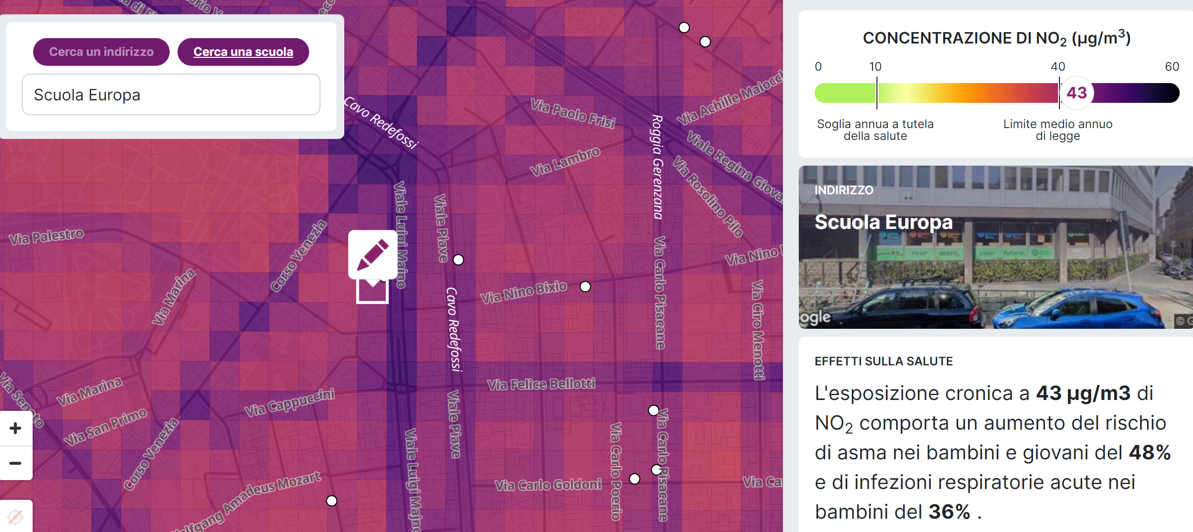 La onlus Cittadini per l’Aria, che da anni monitora specialmente l’inquinamento di biossido di azoto, dovuto soprattutto ai motori diesel, ha pubblicato ieri una mappa da cui è possibile stimare la concentrazione di NO2 in ogni via della città. Ne emerge un quadro impietoso: oltre la metà delle scuole milanesi — nei cui pressi si trovano gran parte delle centraline per il rilevamento della NO2 — sono collocate in aree in cui l’esposizione a questo inquinante supera il limite di legge, che già di per sé è quattro volte superiore a quello indicato dall’Oms. Il biossido di azoto è connesso a un incremento del rischio di infarto, oltre all’asma e ad altre patologie respiratorie, e ha effetti particolarmente gravi nell’età dello sviluppo.